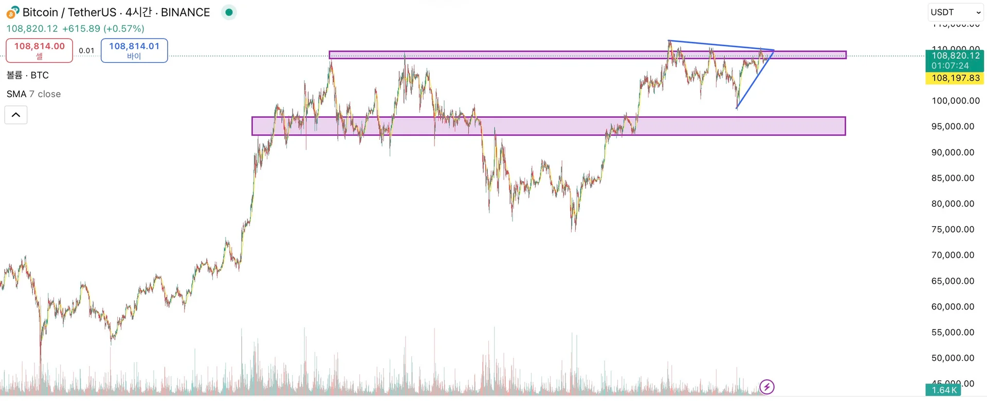 단기적으로 봤을 때 저점이 높아지고 있고, 신고가에 도전하고 있습니다.