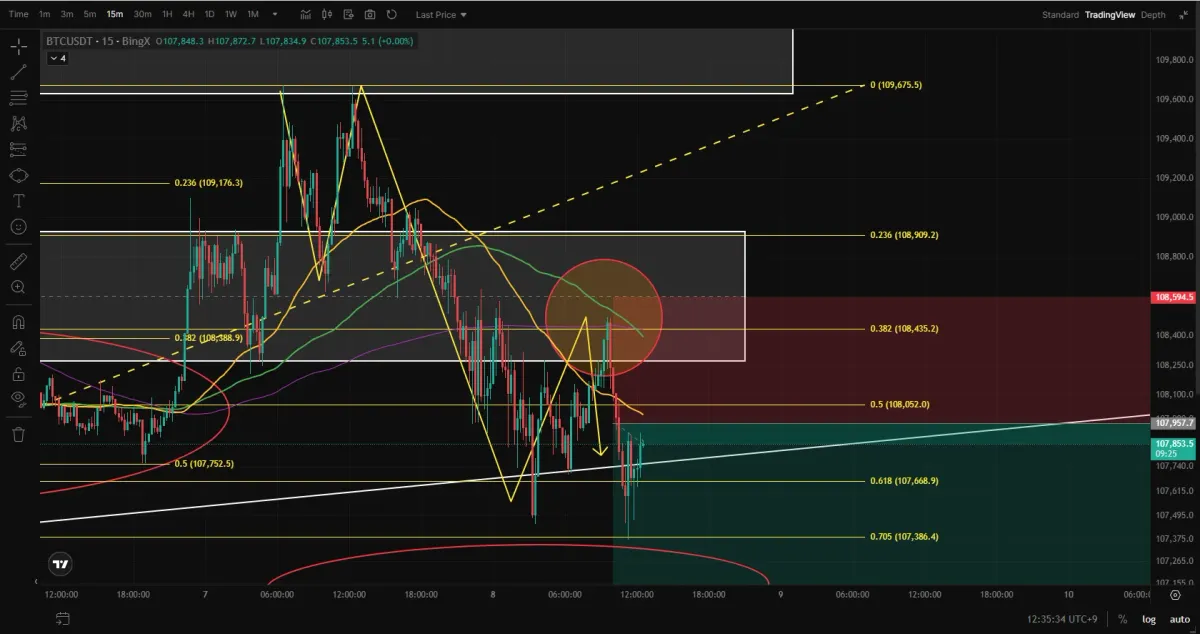 15분봉의 하락추세에서 피보나치 확장을 찍어보면