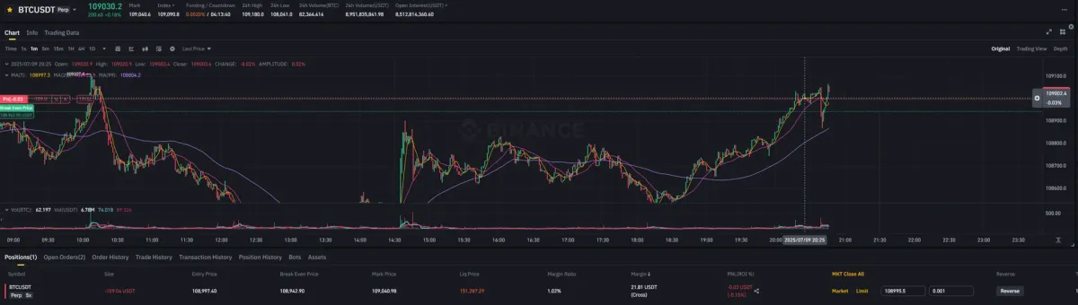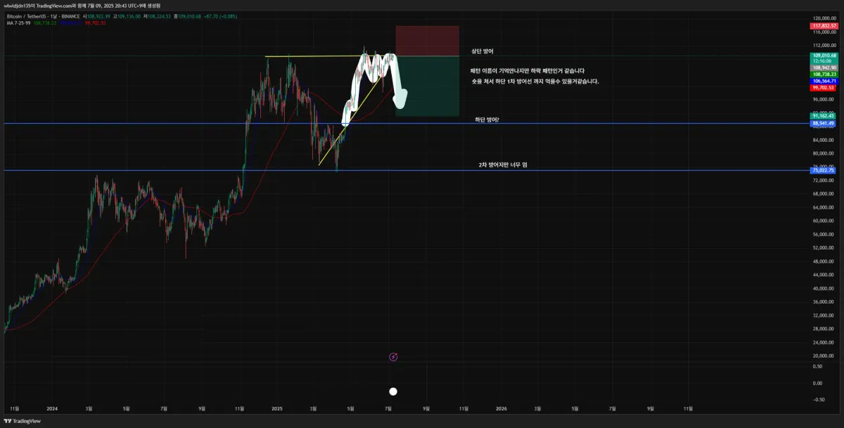 - 매매 일자, 진입가, 목표가 등 기본 정보 - 2025.07.09 20:30 경, 진입가 : 108,997.40, 목표가 : 100277.6