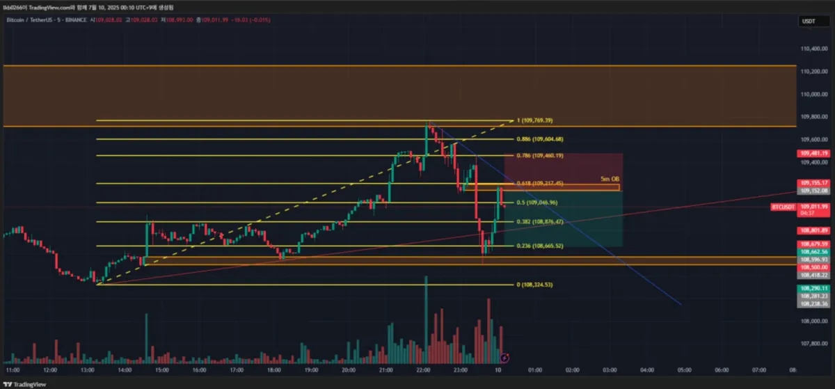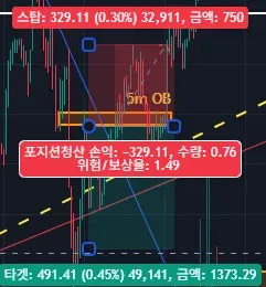 -짧은 반등을 하였지만 0.618부근과 5m OB 부근에 맞고 멈추었다.