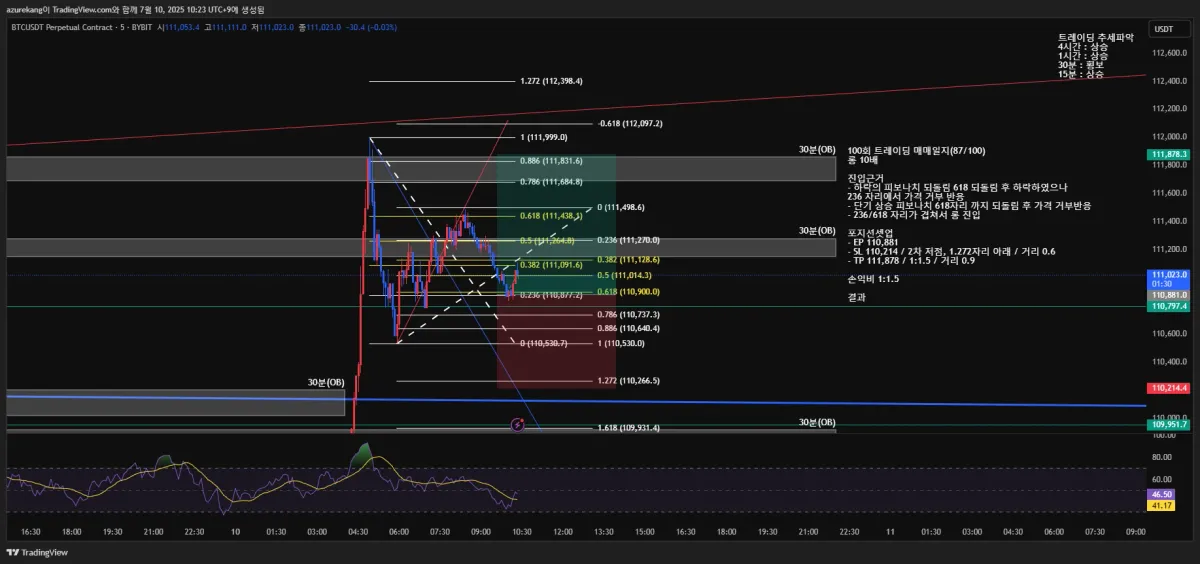 - SL 110,214 / 2차 저점, 1.272자리 아래 / 거리 0.6