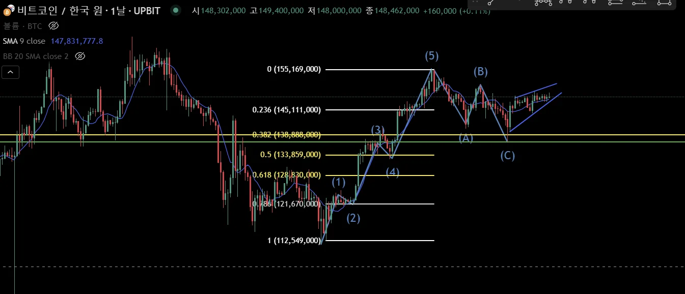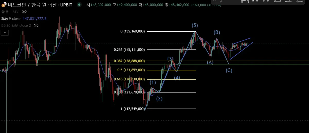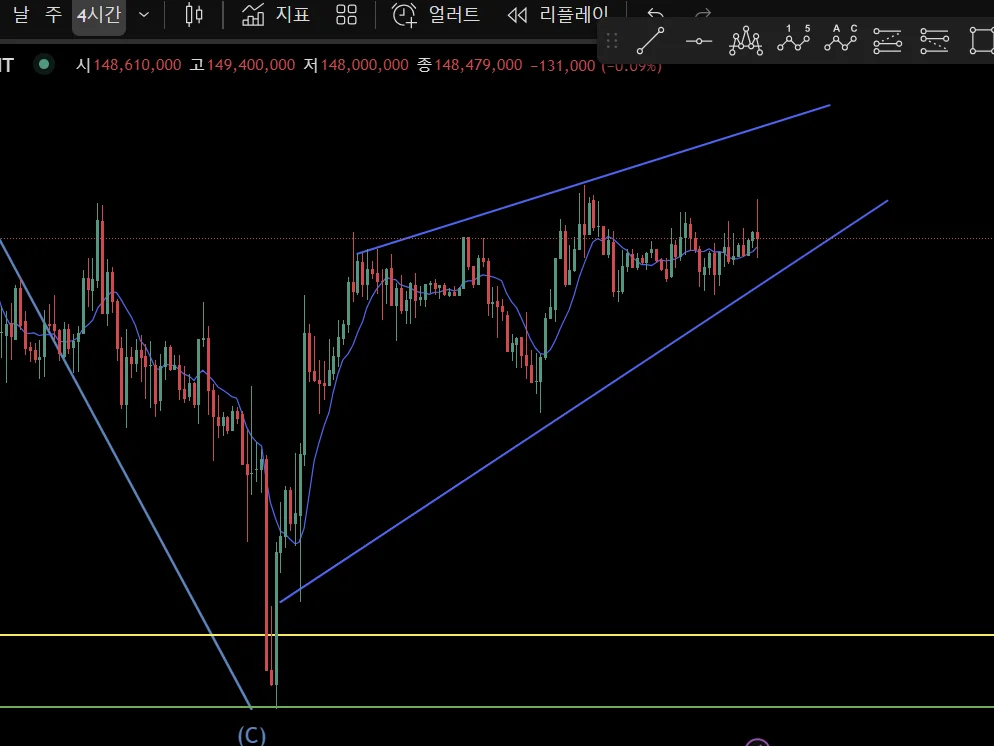 이후의 추세를 보니 큰 상승이 이어져 바로 151,000,000부근에 매도했고 그 이후의 추세를 보니 그어놨던 수렴 선을 넘어서 위로 올라갔다. 수렴이 아니었던건지 내가 잘 선을 그은건지 솔직히 잘 모르겠다. 좀 더 공부를 해야겠다.