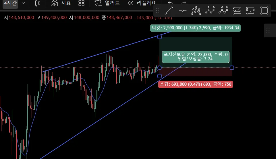 최근의 움직임의 추세선을 그어보니 위로 웻지 모양이 나오는것으로 보여 4시간으로 보니 뚜렷하게 보였다 그래서 현재 위치가 수렴하는 위치이며 반대방향인 왼쪽으로 떨어지기 전 수렴이라고 판단 위쪽 추세선까지를 이익점 아래 추세선을 손절점으로 1:3손익비를 맞췄다.
