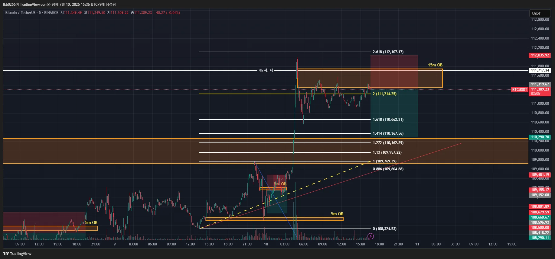 -15m OB를 못 뚫고 있어 숏 트라이 해봤습니다. 0.66 거리기에 20배에서 15배로 줄여서 10% 손실만 받으려고 합니다.