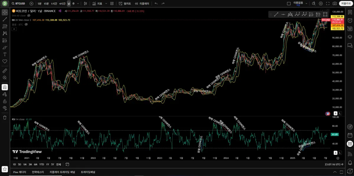 7일 챌린지크레이지 도그 rsi 지표를 통한 다이버전스 확인.