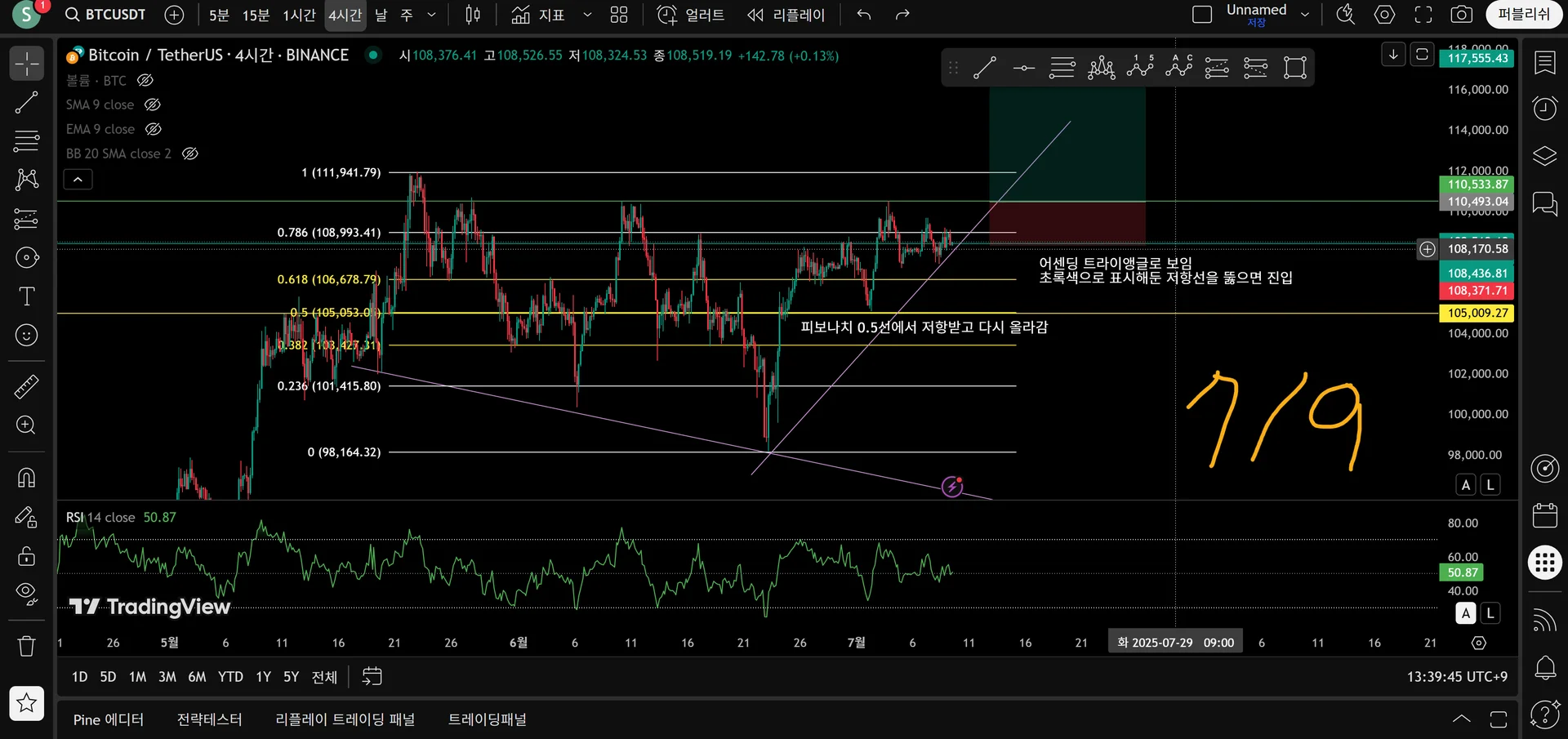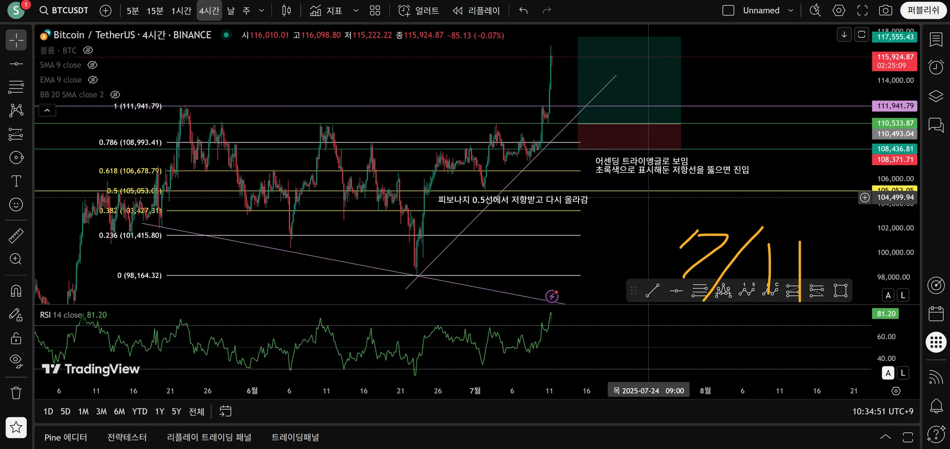 7월9일 분석하여 진입하려 했지만 매수하지 않아 시간이 흘렀습니다ㅜㅜ 놓쳐버린 수익이 아쉽네요.