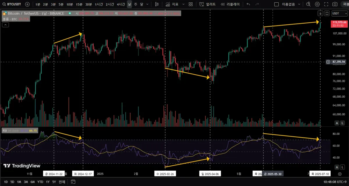 2025-05-22부터 2025-07-10깢 양봉 상단의 가격은 상승했는데, RSI는 과매수 구간에서부터 낮아져서 하락 다이버전스를 나타냅니다.