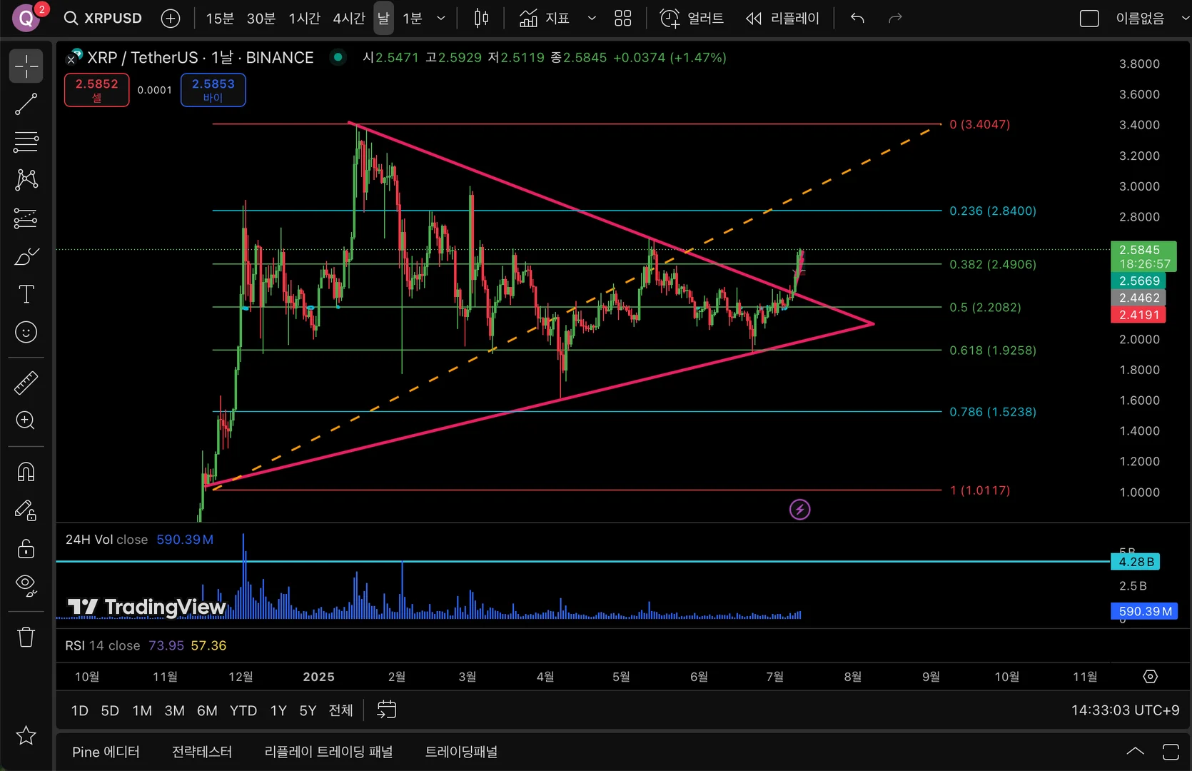 저는 이 수평선들이 유의미한 지지/저항선으로 작용하여 삼각수렴 돌파후 0.236 선에서 강한 저항을 받아 떨어져서