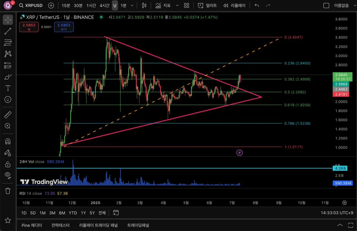 리플 차트입니다! 현재까지 보기에 일봉으로 삼각수렴 패턴을 상방돌파한 듯한 모습을 보여서 앞으로 상승 추세일 거라고 판단했습니다.