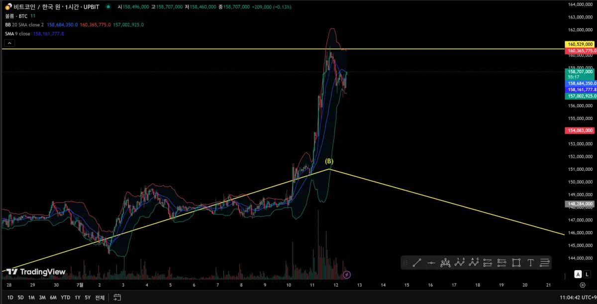 차트2 : 7월 12일 오전 11시 기준, 10일 기준 그려놓았던 저항선까지 올라갔다가 저항을 받고, 하락 중