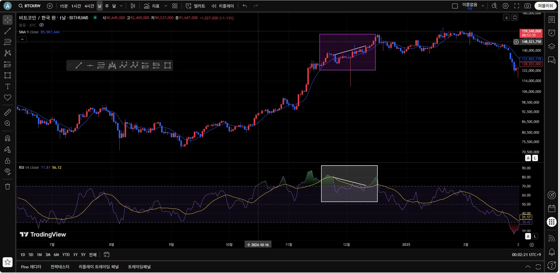상승하는 그래프와 달리 RSI 지표는 하락해 다이버전스로 보았습니다