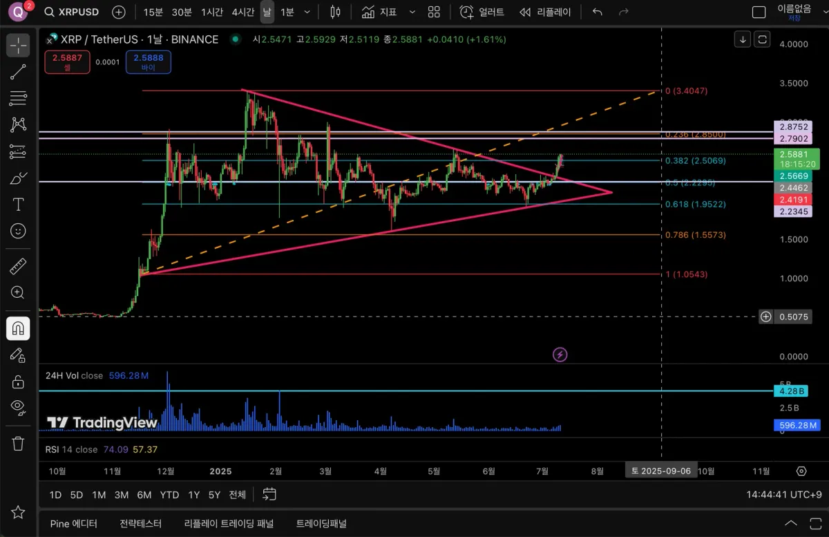 시나리오 : 삼각수렴의 상방돌파 이후 강한 상승추세로 2.85달러까지 상승 후 강한 저항을 맞고 0.5선인 2.22 달러 부근까지 하락할 것으로 예상