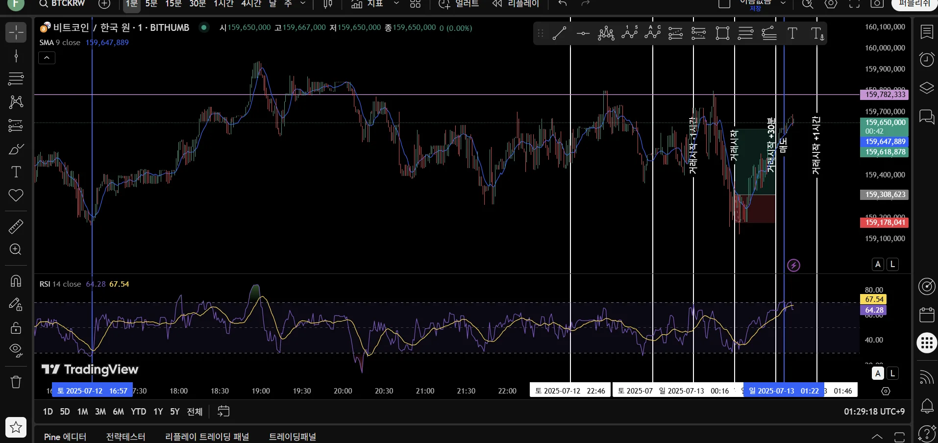 1분봉 차트로 7월 12일 16시 57분에 저점을 찍었고 거래를 시작하기까지 차트가 박스권이라 생각했다.