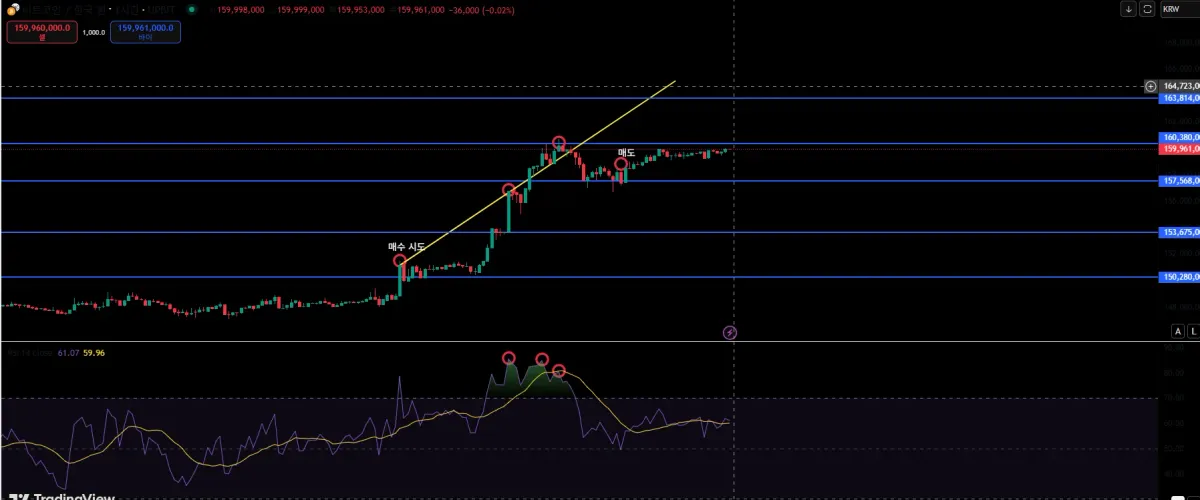 첫 장대 양봉에서 매수 하였고 계속 고점을 높여가면서 가격이 상승했으나 두번째 고점보다 마지막 고점의 RSI가 상대적으로 약해지고 그 이후에 하락하는 모습을보여 지켜보다 가로줄 터치하는 것을 보고 매도 처리 했음. RSI가 다이버전스 되었을 때 매도 하였으면 좋았겠지만 후회는 없음. 또한 지금 계속 RSI나 차트가 횡보중인데 전고점을 돌파하는지 여부를 확인하고 추가 매수 시도해볼 예정임.