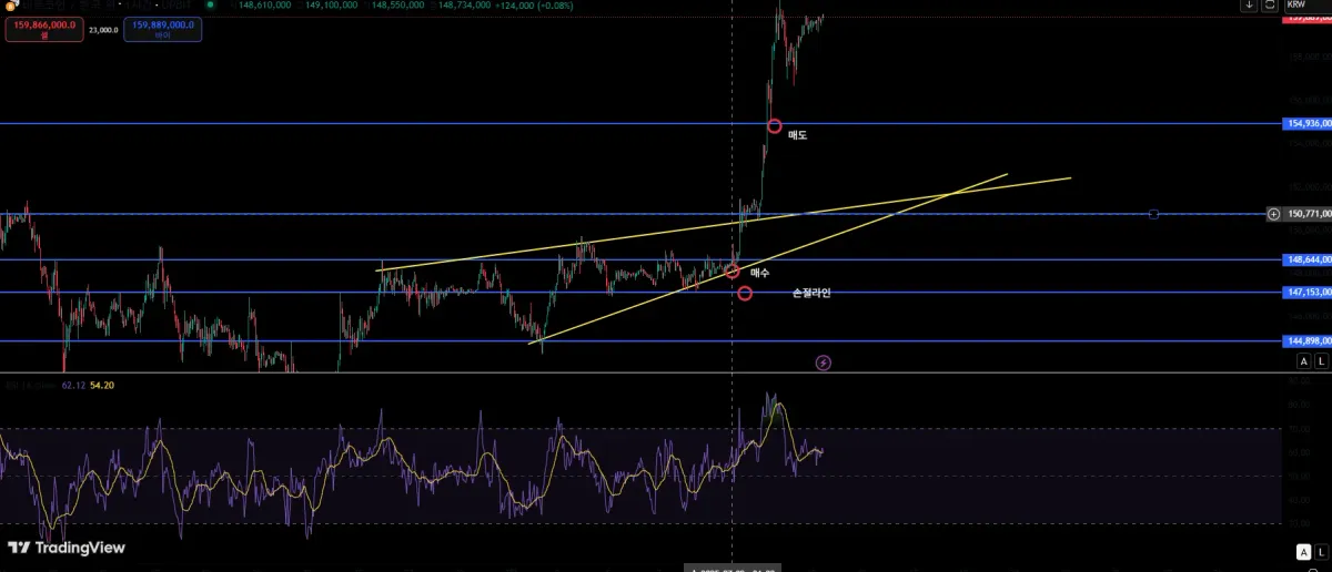 추세선 하방선에 매수타점을 잡고, 상승으로 더 갈것 같아서 일단 매수 하였습니다.