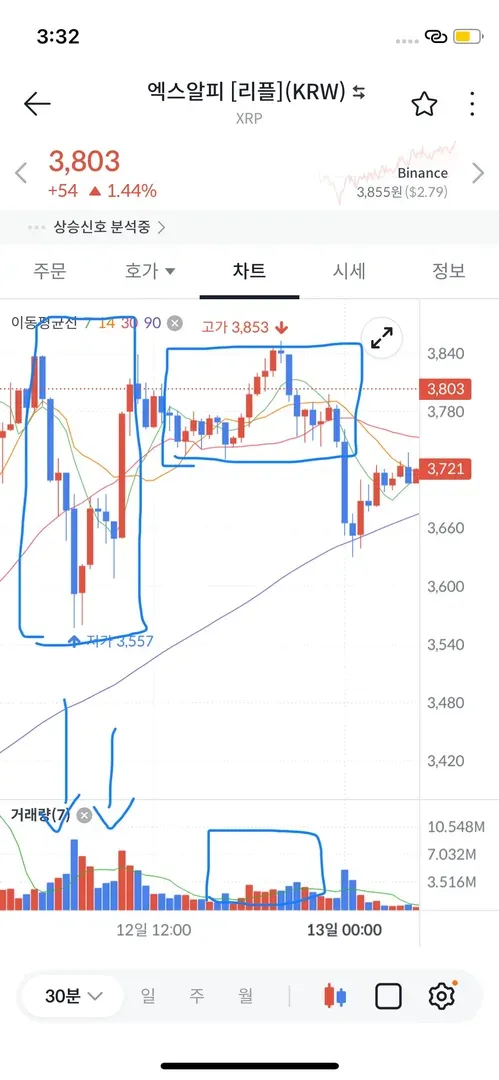 다른 지표 개념은 아직 너무 어려워서 ‘거래량’과 ‘매물대‘ 2가지 기준으로만 파악하려고 노력해봤고, 마침 2일전 상승장이 왔을 때 ‘원하는 만큼 수익이 안나더라도 익절연습을 해보자!’라는 생각이 문득 들었습니다.