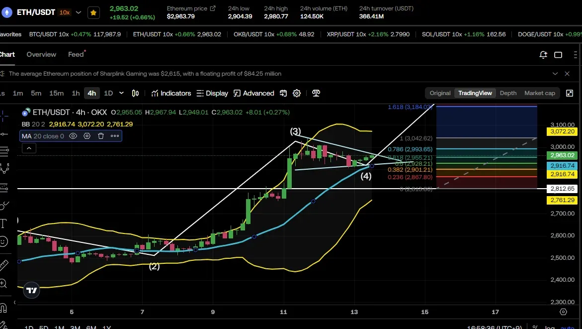 4시간봉 으로 볼린저 밴드 미들 지지받고 20ma 지지받고 캔들 양봉 하나 더 확인되면 롱들어가볼 생각임