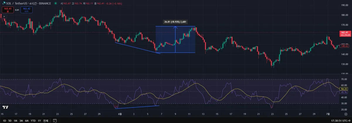 솔라나의 4시간 봉을 보다가 해당 다이버전스를 발견하였고, 이후 약 19%의 상승이 있었음을 확인하였습니다.