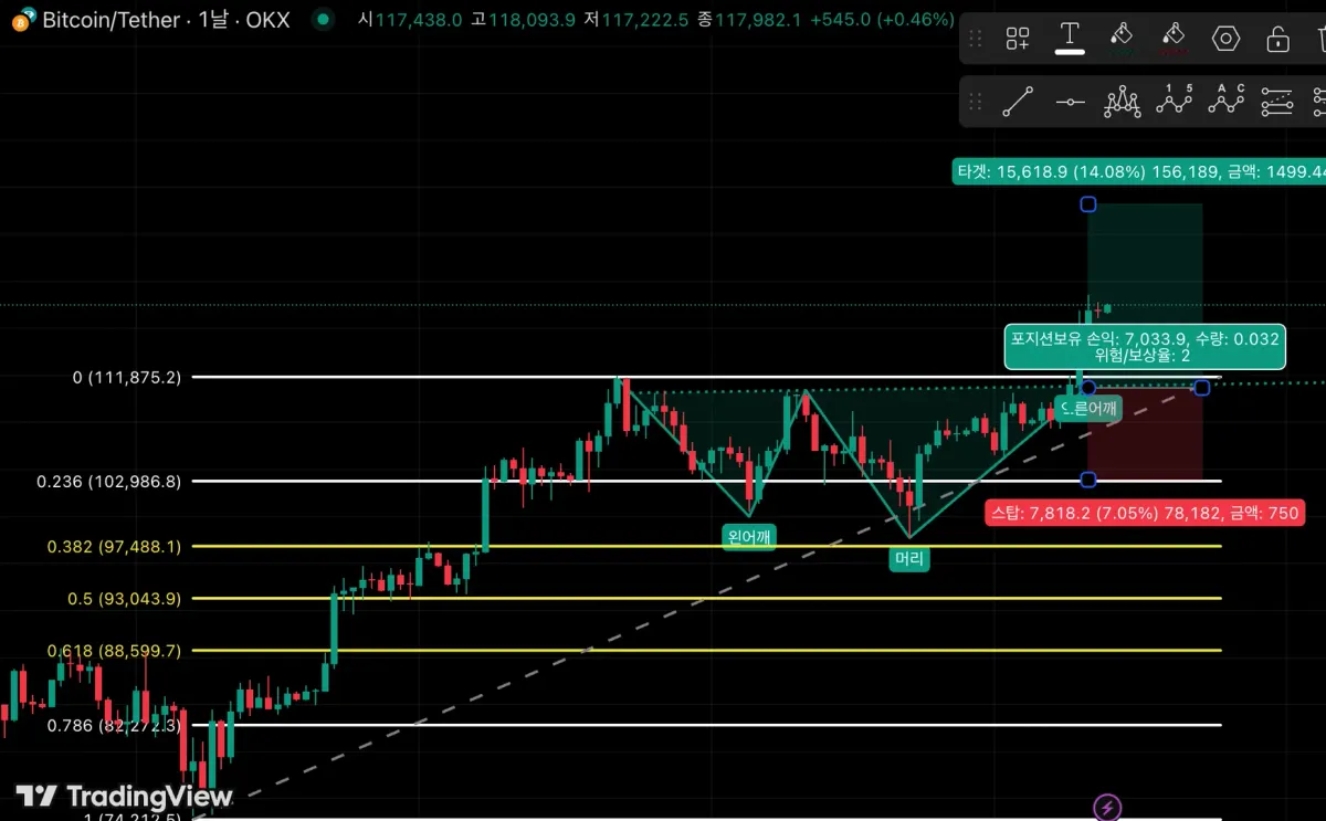 비트코인 날봉에서 쌍봉이 보이고 피보나치 지지선에도 걸리길래 매수포지션을 잡았다.