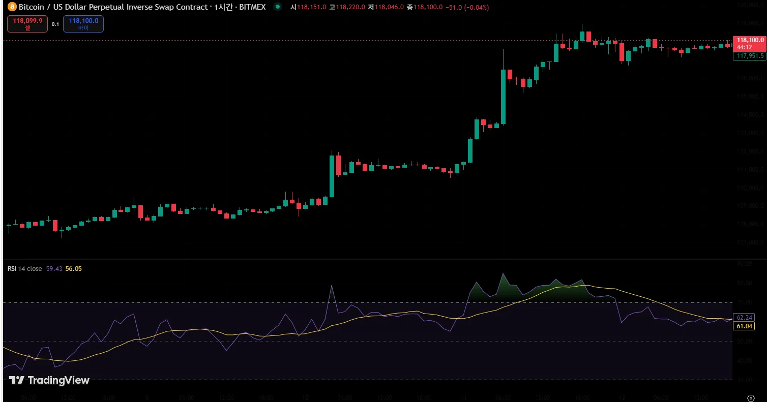 이 1시간봉 비트코인 차트와 RSI를 분석해 보면 하락 다이버전스의 신호가 나타나고 있다고 생각합니다.