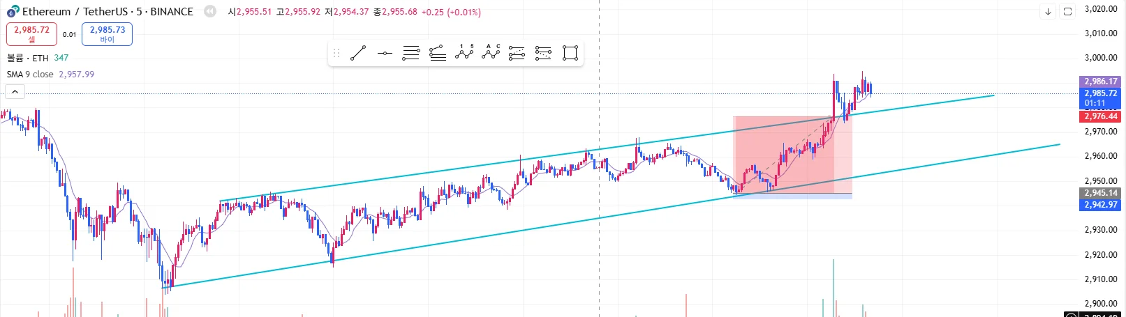 손절가는 추세선 하방이탈 가격인 2940달러 부근에서 손절예정이었음