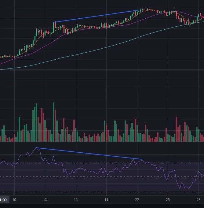 차트의 고점이 높아지고 있지만 고점으로 갈수록 거래량도 줄고 있고 rsi 지수 역시 줄면서 하락 다이버전스를 바라볼수 있습니다.