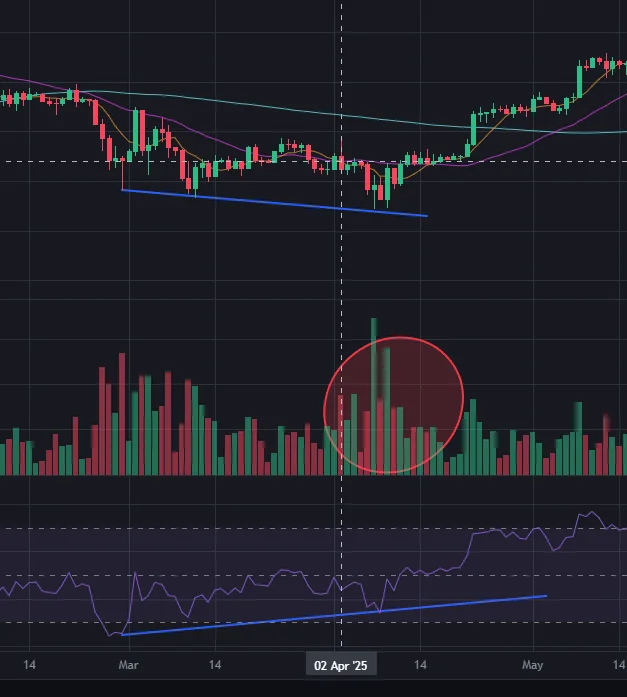 차트의 저점이 낮아지고 있지만 거래량이 줄고 있고 rsi 지수가 상승하면서 매수세가 붙고 있다고 볼수 있고 상승다이버전스로 볼수있습니다.