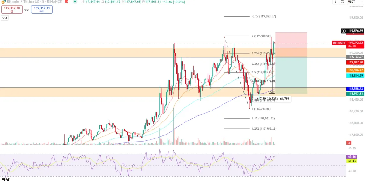 볼린저 상단에 이미 닿았기 때문에 내려줄 것 같았꼬 바로ㅓ 직전 캔들에 위꼬리가 길게 달린 것을 확인 rsi는 66 으로 과열상태는 아니지만 한번 내려줄 거라고 생각함. 패턴은 쌍바닥 모양(더블바텀)모양이지만 넥라인을 돌파해주지 못하면 떨어질 거라고 생각해서 진입했는데 벌써 손절 날 것 같아서 무섭네용.. 흑흑