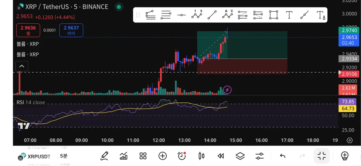 - 1분 봉에서 작게나마 상승 추세선 형성.