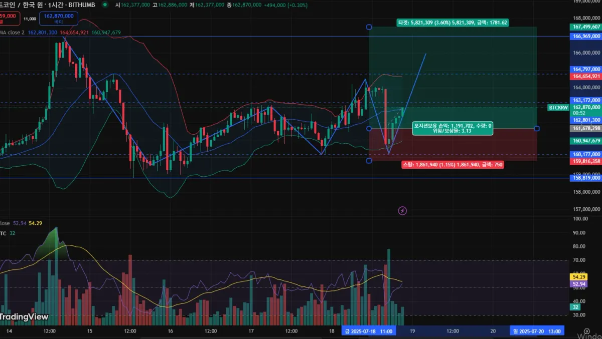 비트코인 장기적으로 우상향 중이며, 단기적으로는 최고가를 갱신하며 리테스팅 중이으로 생각됩니다. 개인적으로 안정적으로 실전연습 쌓기에 좋다고 생각하여 하루에 한번씩 소액으로 비트코인 매매를 하여 몇 만원씩 이라도 수익을 내는 연습을 하고 있습니다.
