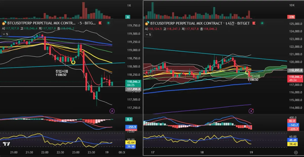 하락하여 다시 5분봉 MACD가 음수로 전환되면서 추세선을 깨고 계속하락하여 1시간봉 200일선 살짝위, 4시간봉 50일선 살짝위 117300.8까지 하락후 반등하였다