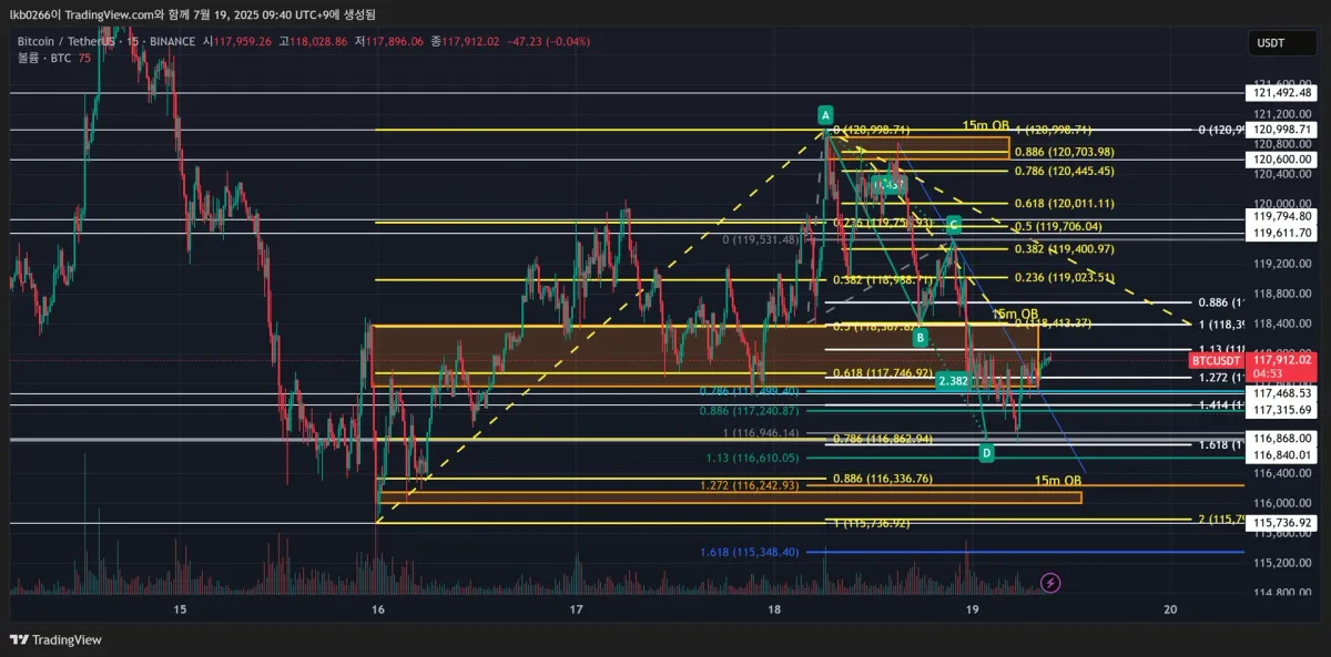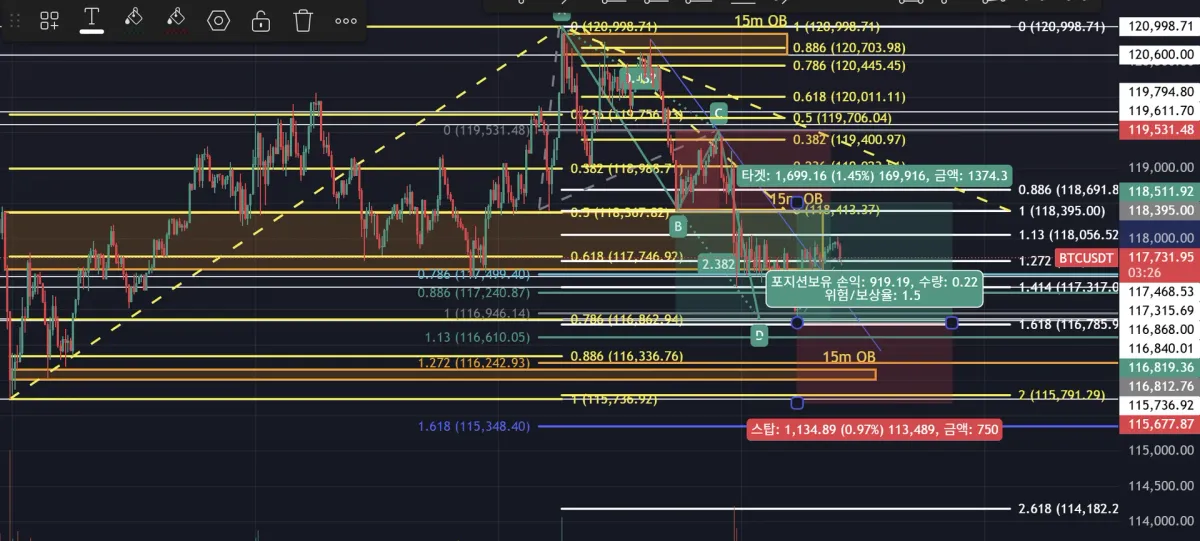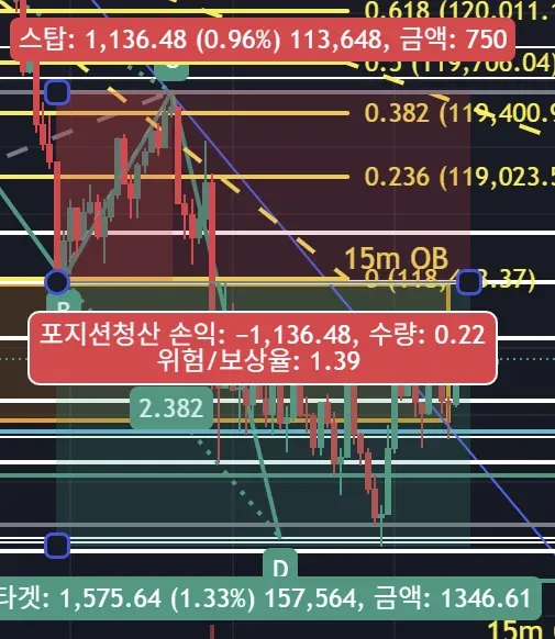 그치만 1h 지지선과 저항선이 촘촘하기에 안 깰 것이다? 라는 생각으로 매매를 임해보겠습니다. (여기서 생각 만약 깬다면, 전 고점부터 ABCD로 1.618까지도 볼 수 있겠죠?)