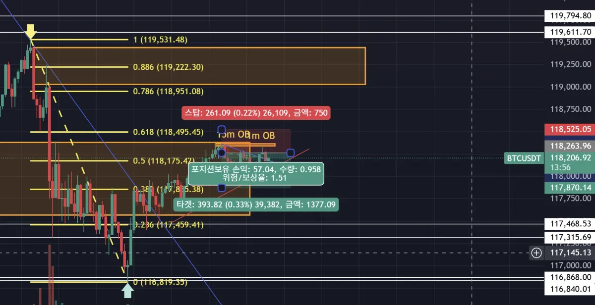 -피보나치 0.618 부근이 뚫리면 손절하고 손익비를 1.5로 잡아봅시다.