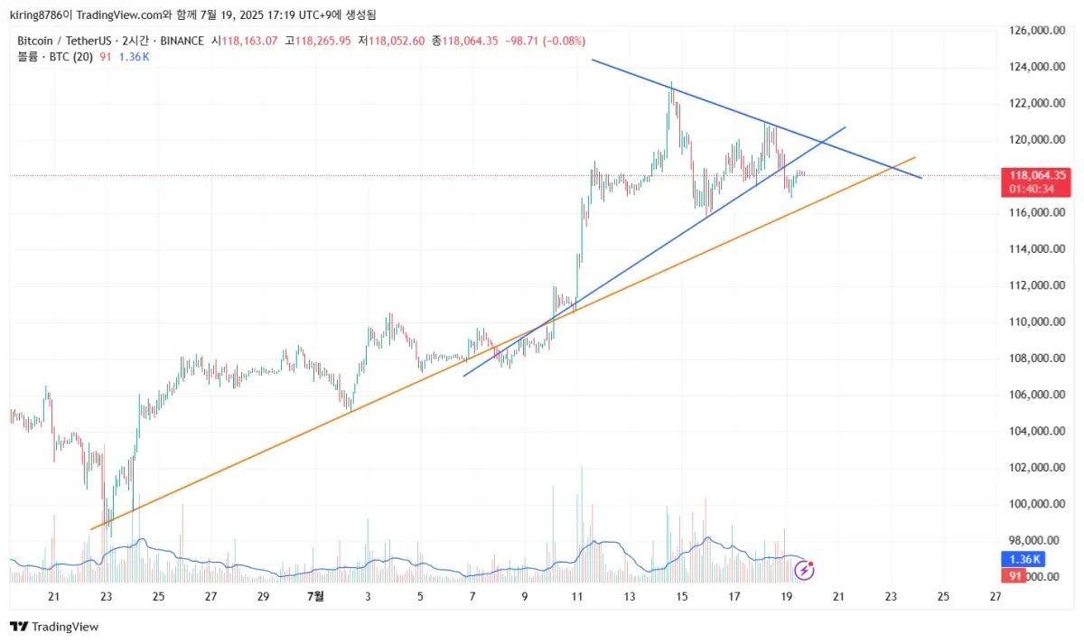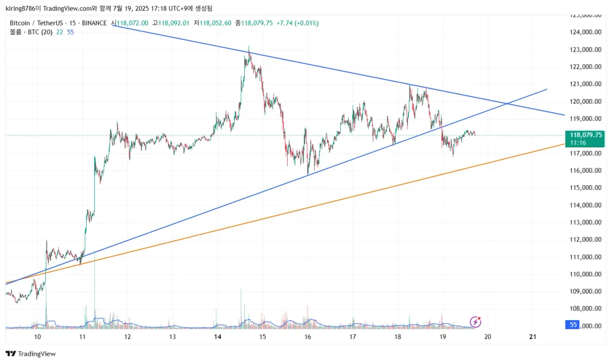 주황선은 지지 윗줄 파란색선은 저항선으로 현재는 생각됩니다.