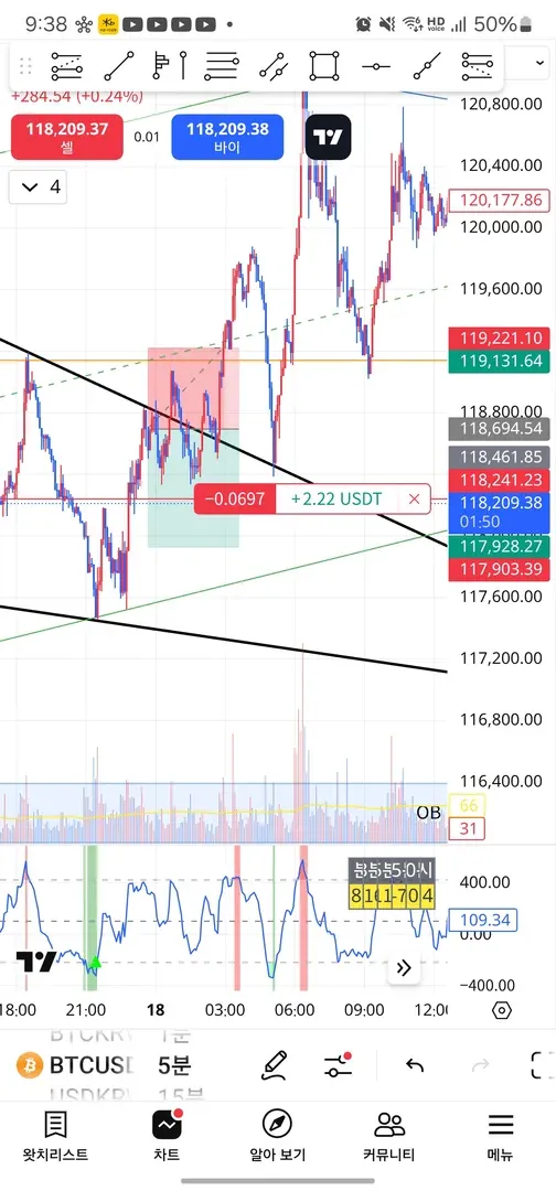 폴링웨지를 보긴했는데 상단 저항 후 하단 지지받고 오를줄 알았습니다만 그대로 뚫었습니다...