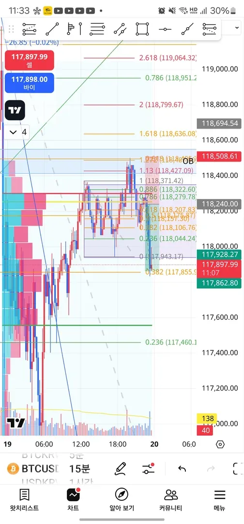 이건 무조건이다 싶은 자리가 뒤늦게 보였고 손절나더라도 절대 후회는 없을 포지션 진입이었고 0.382되돌림 자리가 딱 손익비 알맞아서 익절라인도 382로 잡았습니다.