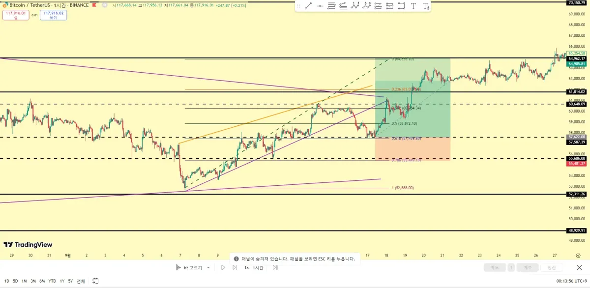 57000 부근 기준선을 지지하여 타겟포인트까지 도달하였습니다.