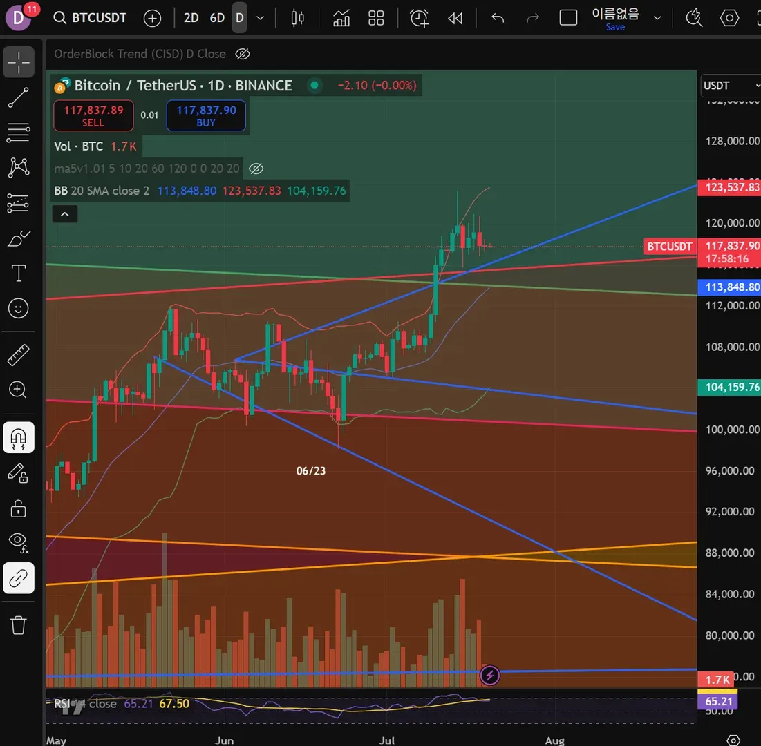 비트코인 장기채널 돌파 후 리테스트 부근에서 매수하고자 하였으나 몇 포인트 부족하게 리테스트하여
