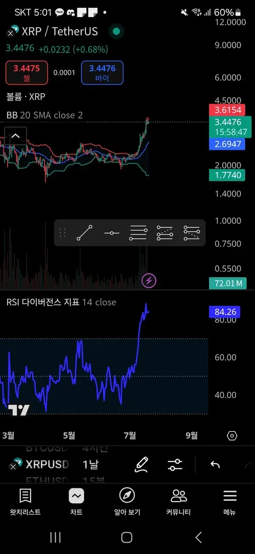 기본적인 셋팅값은 냅두고 볼린저 밴드와 rsi지표를 말해주셔서 추가했습니다