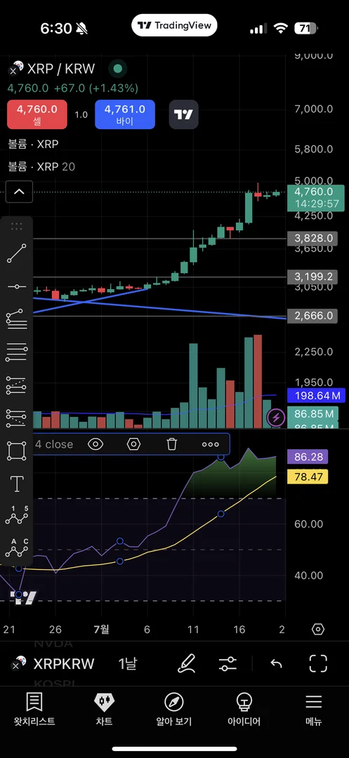 비트 차트로 공부 하시라 하였으나 강의 초반 여러 차트를 보는 중 리플의 횡보기간이 끝나는걸로 보여 테스트로 15000원정도 매수하였었습니다.