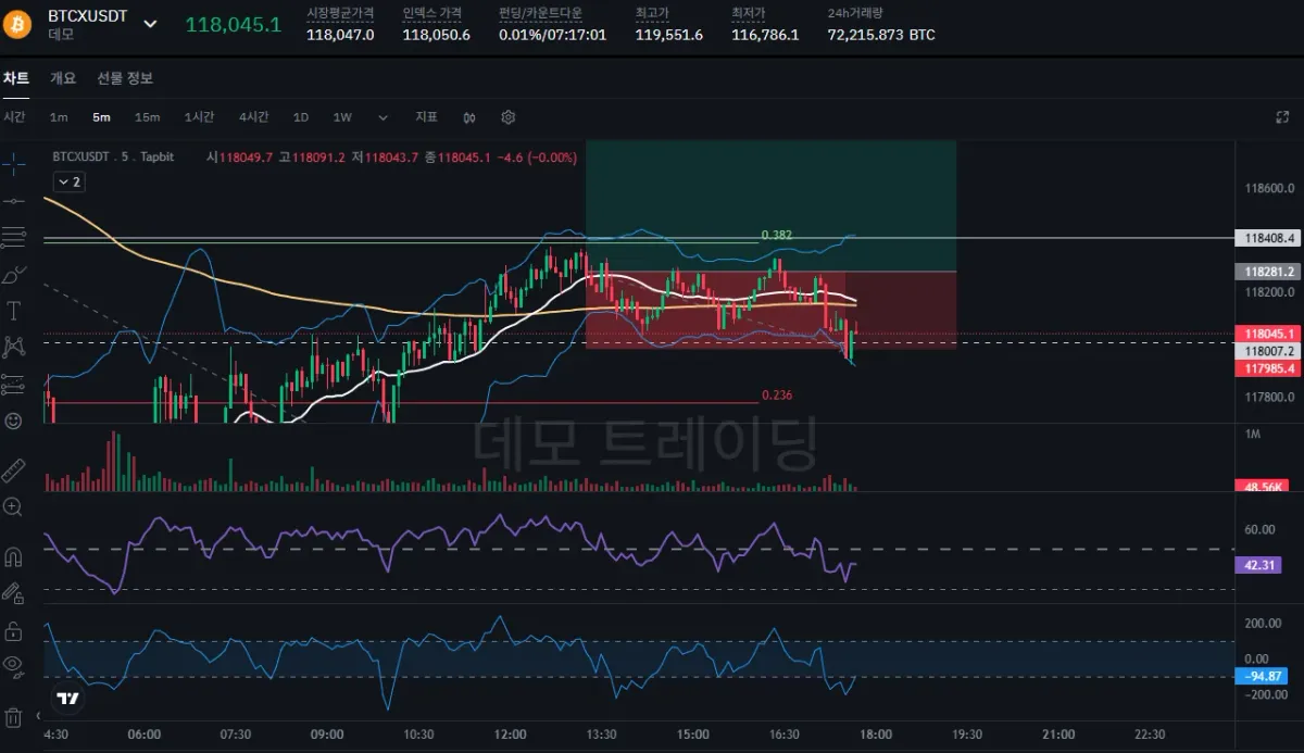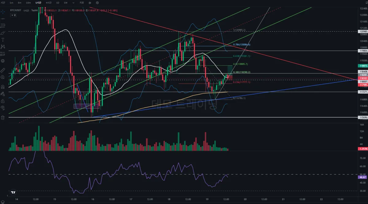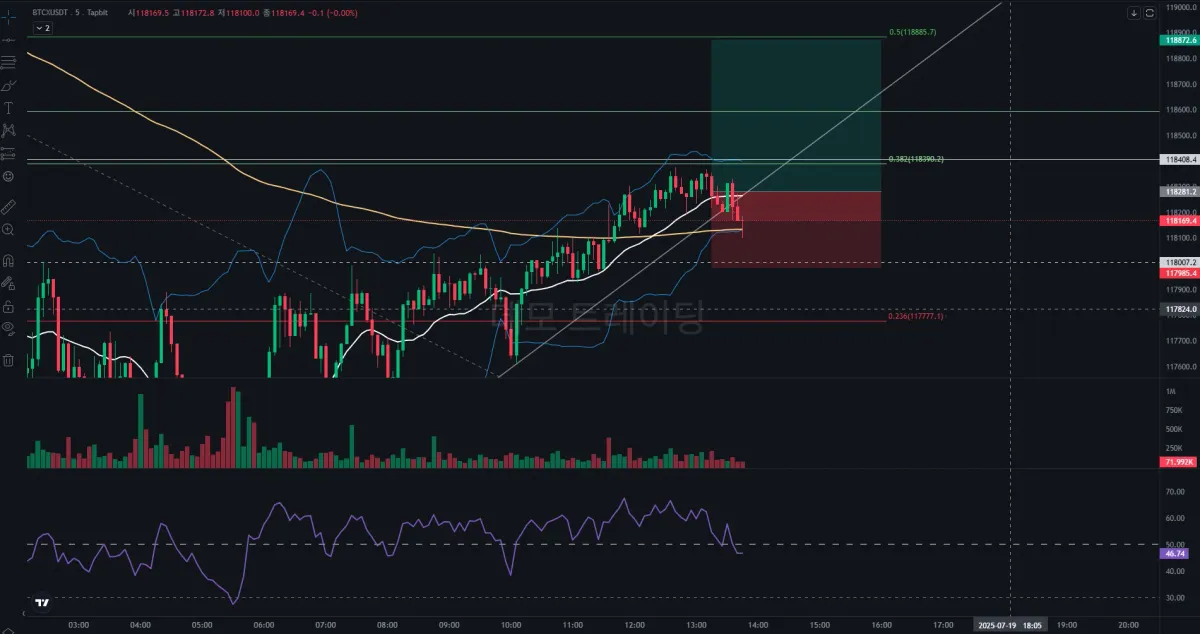 결과적으로 상승하지 못하고 횡보 중 손절선 터치. 주말이라 거래량이 없어 조심히 본다면, 피보나치 0.382 되돌림 구간을 돌파 못하는 것으로 봐서, 하락 추세가 지속될 수 있다고 봄.