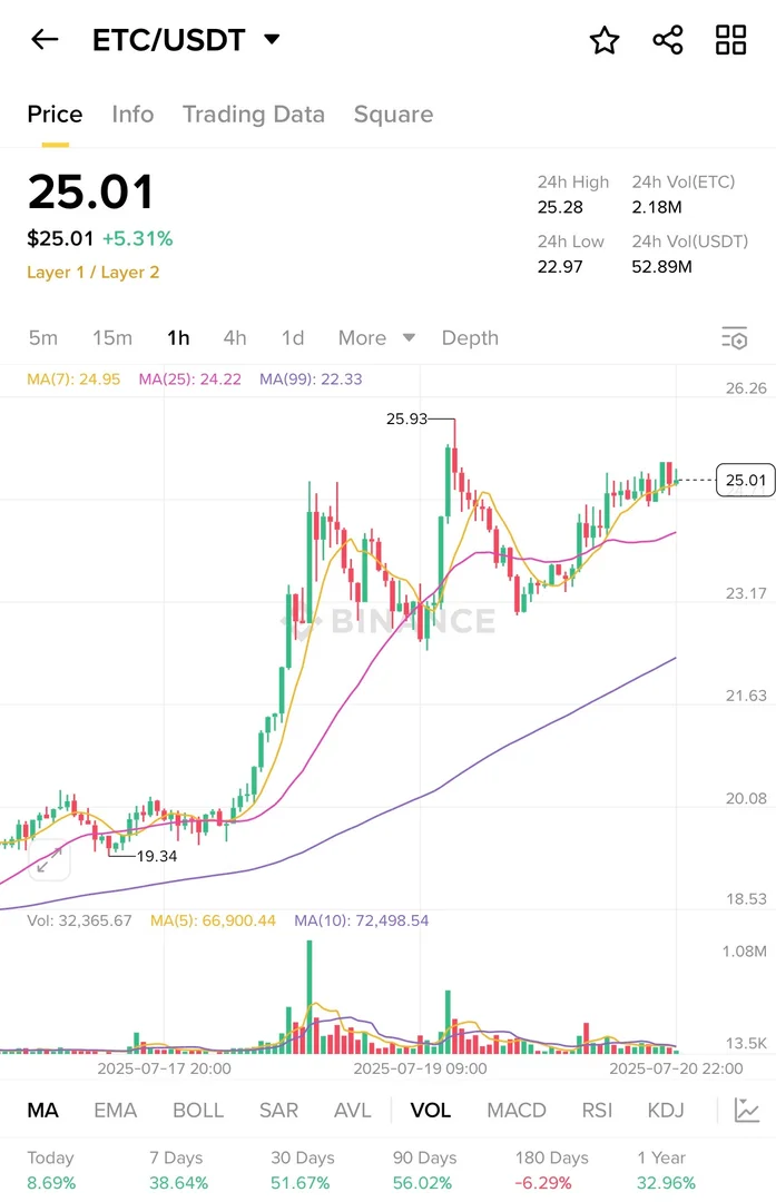 이전 신고점인 25.00달러를 돌파하는 것을 보고 돌파매매를 시도했습니다. 하지만 짧은 타임스케일(5분)으로 보았을 때 조정을 받고 횡보하여 손절했습니다. ㅠㅠ 2025년 7월 19일 13시에 일어난 일입니다.