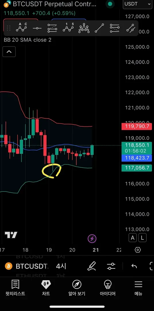 4시간봉 볼밴 하단 터치후 올라와주었길래 117900에서 진입했습니다 6프로 정도 수익 얻었습니다