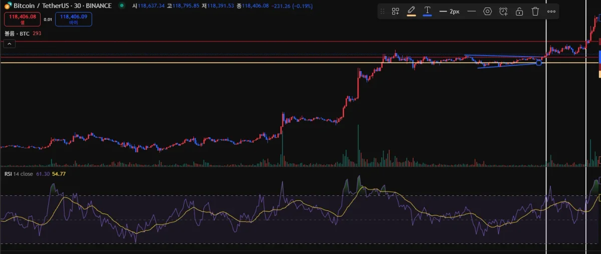 천천히 횡보하다가 저항선을 뚫고 거래량이 많아지는 타이밍에 매수 계획을 세우고 익절 라인은 빨간 선, 손절 라인은 노란 선으로 설정 -> 첫 번째 하얀 선에 매수 -> 약 13시간 뒤인 두 번째 하얀 선에 매도 -> 약 2.5퍼의 수익 생성