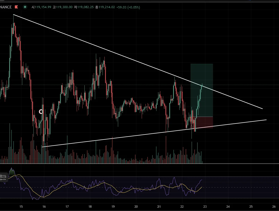 웻지나 삼각수렴으로 보고 있었고 진입 시점에 하단 경계를 터치하여서 횡보를 하더라도 하단 경계는 더 가지 않고 결국 윗 경계로 갈거라 생각 함