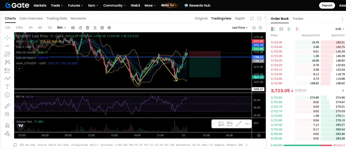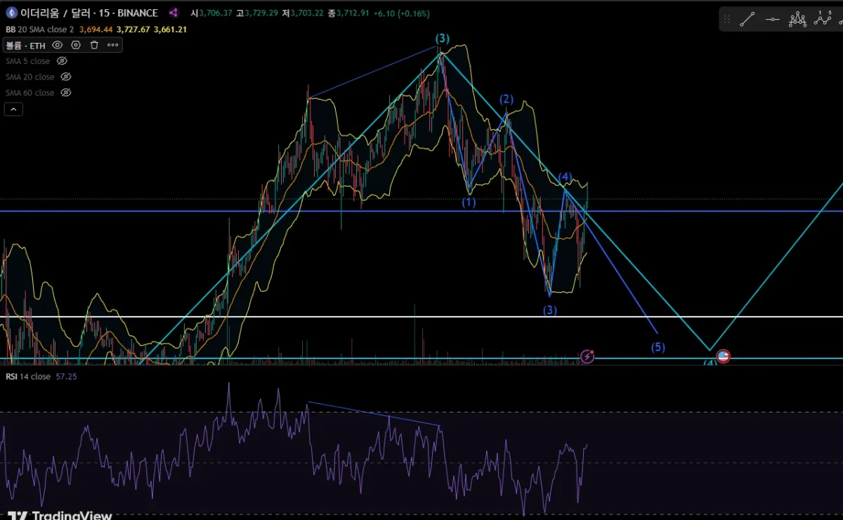 이더 15분봉 체크했을 때 단기적으로 엘리엇 5파 나오면서 하락추세, 장기적으로는 4파 진행됨에 따라 반등 후 5파를 생각해서 하얀선(3600)을 뚫고 하늘색선 터치하고 하얀선 다시 올라오는 거 확인하고 롱 진입 하려고 했습니다만 거래량이 많지 않고, 언제 내려올지도 몰라 단타라도 해보자 싶었습니다.