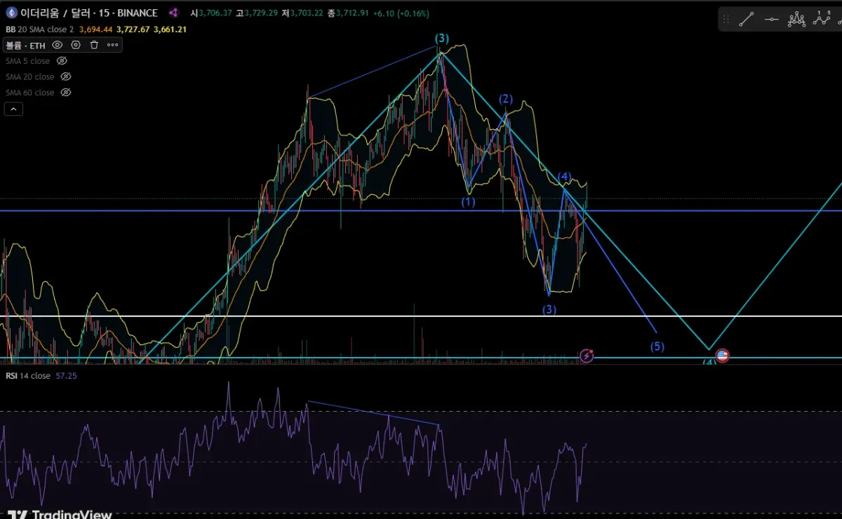 이더 15분봉 체크했을 때 단기적으로 엘리엇 5파 나오면서 하락추세, 장기적으로는 4파 진행됨에 따라 반등 후 5파를 생각해서 하얀선(3600)을 뚫고 하늘색선 터치하고 하얀선 다시 올라오는 거 확인하고 롱 진입 하려고 했습니다만 거래량이 많지 않고, 언제 내려올지도 몰라 단타라도 해보자 싶었습니다.