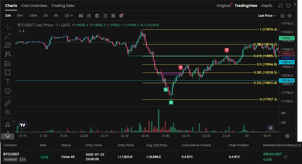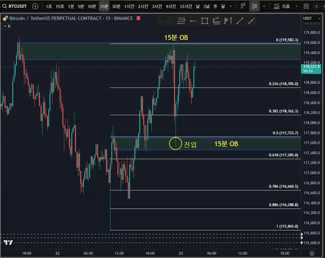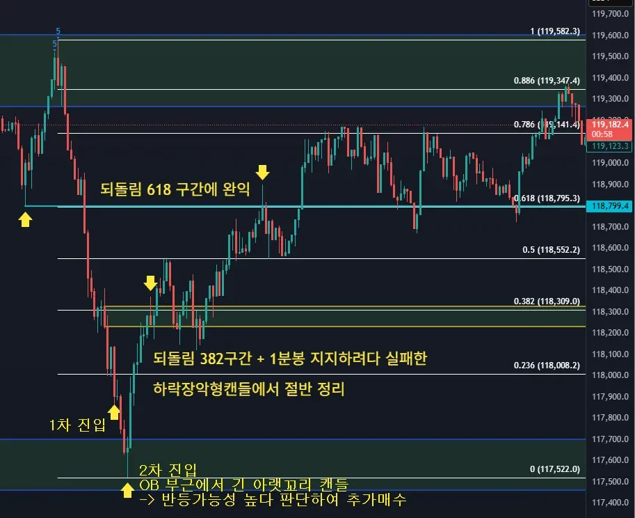 2) 1분봉 OB부근에서 긴 아랫꼬리 후 양봉 -> 가격 거부반응 판단 추매