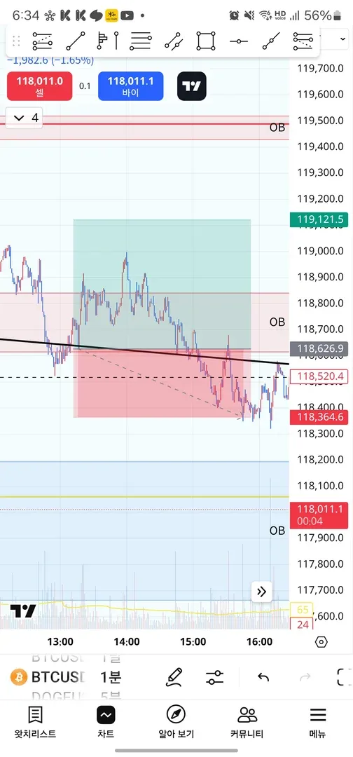 제가 포지션 진입을 고려했던 오더블럭과 618되돌림에서 가격거부반응이 왔고 예상대로 거부반응으로 단기 상승했으나 급추락... 추락하는 캔들에는 날개가 없다..