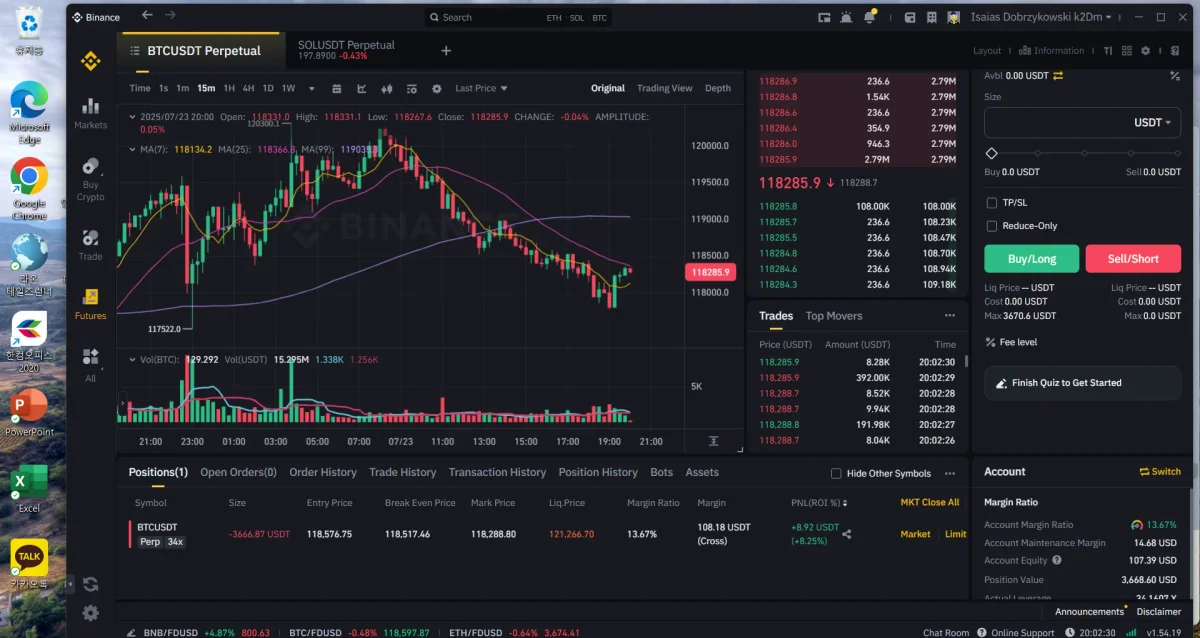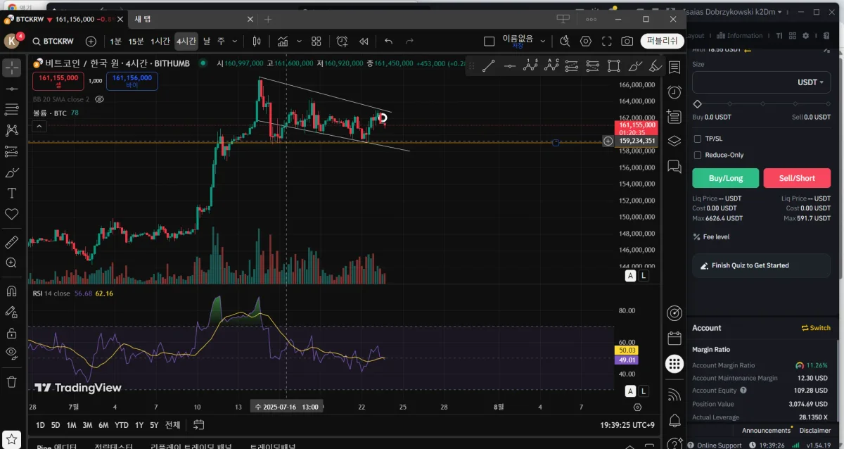 크게 본다는 느낌보다는 짧게 매매해보고자 우선 4시간봉을 보았습니다. (날봉에서는 수렴구간이라 판단하여서 입니다.) 그 다음에는 추세선을 그어보았고 저항 구간도 가로줄로 그어보았습니다. 보니까 딱 추세 박스권 안에서 왓다갔다 한다고 판단하였습니다. 그 다음 1시간 봉을 보니 박스권에서 이제 하락할 상황이겠거니 싶어서 숏을 진입해보았습니다. (동그라미 친부분입니다) 그 이후 한 6시간 뒤 확인해보니 약간의 수익을 얻을 수 있었습니다. 소액이여서 좀 큰 레버러지를 이용했습니다. 분봉 보고있다가 상승폭이 나오는고 있는 것 같아서 우선 8% 정도에서 마무리 하엿습니다.
